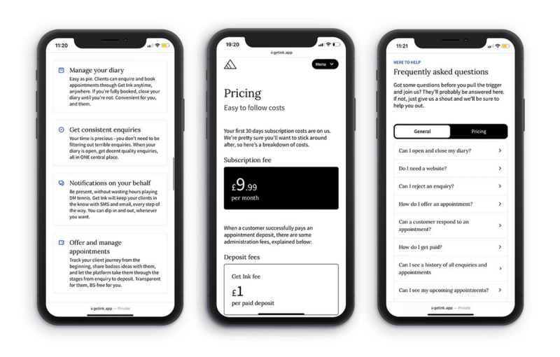 Nailing Get Ink’s tone of voice from the outset was key to creating their identity. The client wanted the brand to sound edgy, just like the artists they are targeting. Incorporating their no-nonsense tone into a series of easy-to-digest pages, it was my job to speak directly to time-poor artists who can’t see the wood from the trees and make them realise that Get Ink understands their problems and can offer a simple solution. Other pages included a transparent cost page and SEO-savvy FAQ’s.